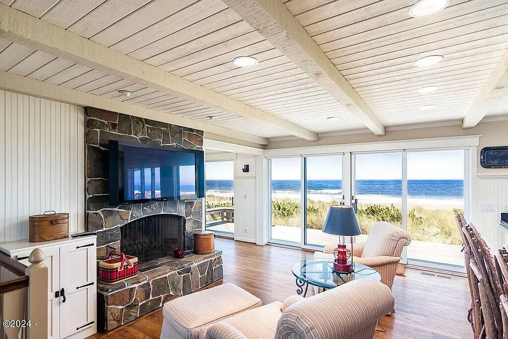 Experience stunning oceanfront living in this beautifully crafted, single-level Salishan home. Featuring hardwood floors, beam ceilings, and two stone fireplaces, this home blends elegance with comfort. The chef’s kitchen offers a Viking 6-burner range, honed granite countertops, and bay-view dining. Enjoy expansive ocean and bay views from multiple rooms, including the oceanfront primary suite and large family/study area. With multiple deck access points, an oversized garage, and premium upgrades like Andersen windows and a new gas furnace, this well-maintained home is move-in ready and perfect for coastal living.